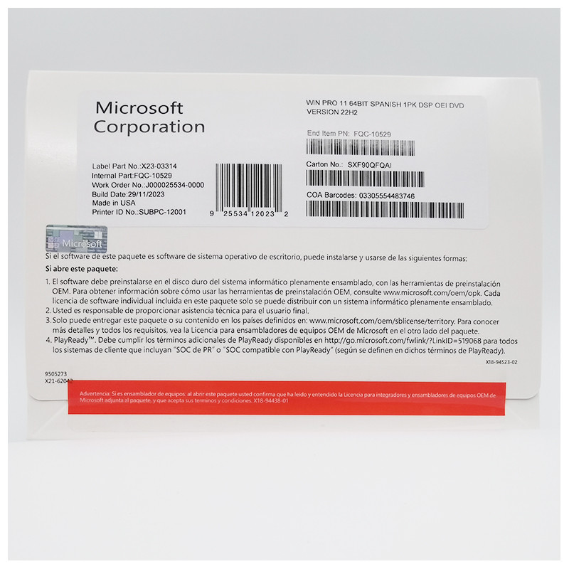 प्रामाणिक विंडोज 11 प्रो OEM CD कुंजी स्पेनिश भाषा पैक शामिल